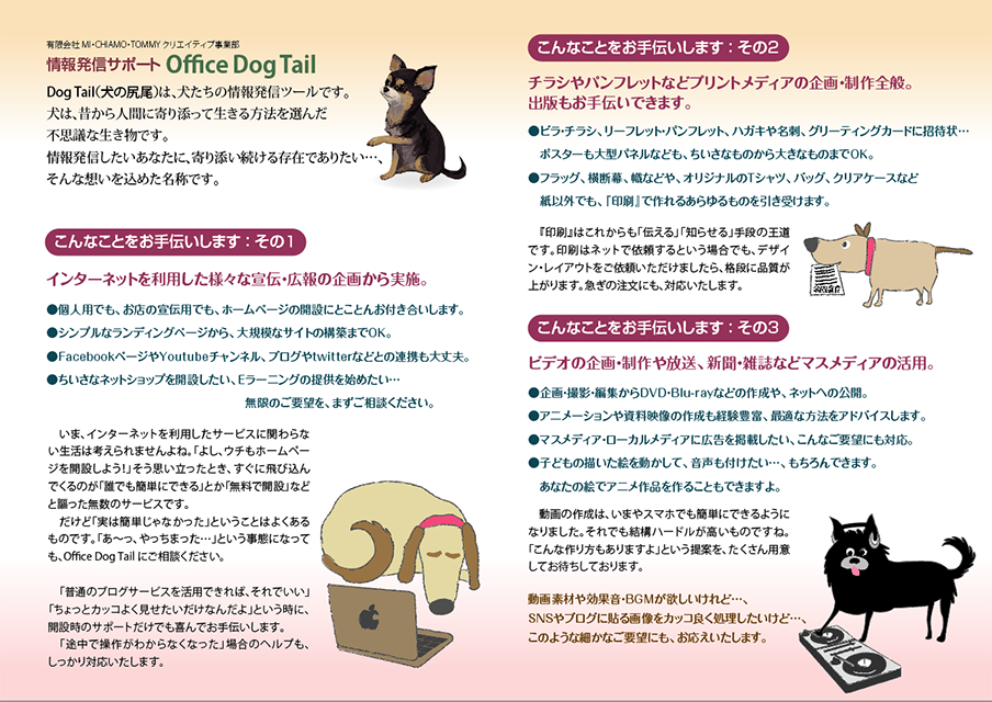 | Flyer | A4判を基本に、単純でも複雑でも引き受けます。「印刷まで」「データだけ」どちらもOK。 費用【安●●●●●高】 |